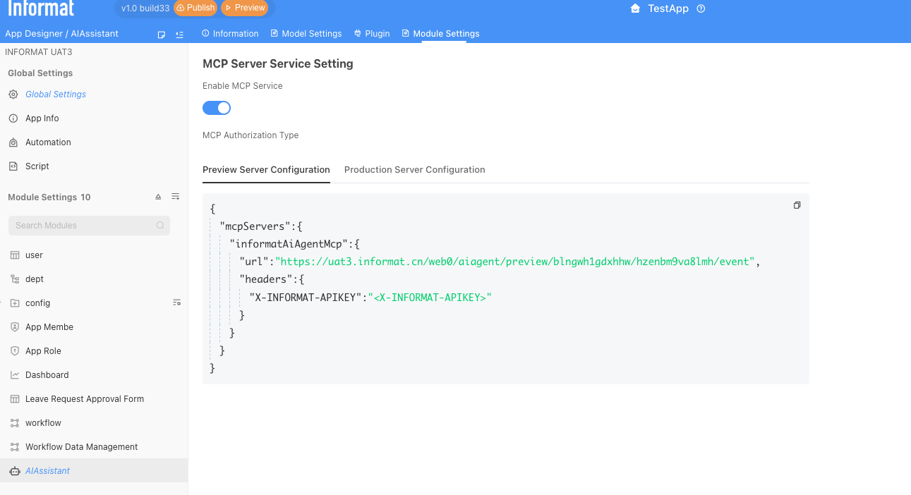 AI Assistant supports deploying the module as an MCP Server for external use. Authentication supports using the platform's API KEY or a custom KEY