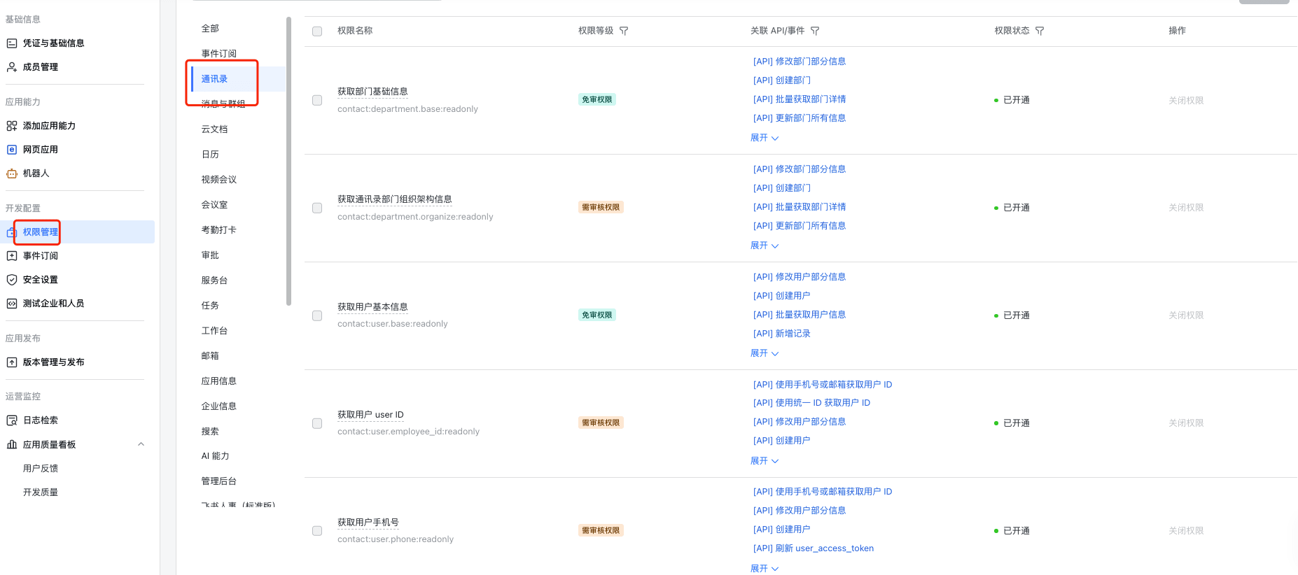 - 开通通讯录权限,至少包含获取部门基础信息、获取通讯录部门组织架构信息、获取用户基本信息、获取用户userID、获取用户手机号、以应用身份读取通讯录这六个权限。